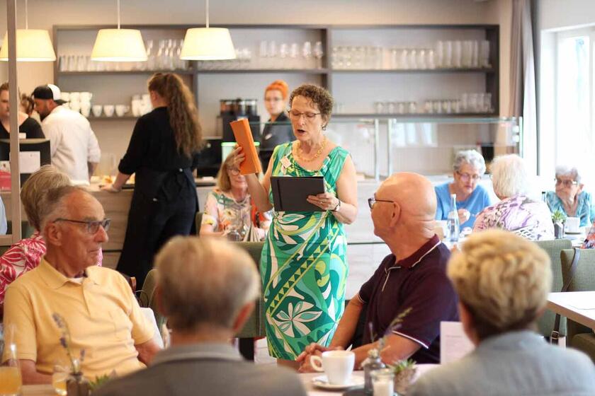 Einrichtungsleitung Jutta Krauß begrüßte die Gäste „[…] Wir kochen täglich für Sie frisch. Und – jetzt gehe ich noch mal in die Vergangenheit – die Familie saß gemeinsam am Tisch zu Essen. Das hat die Gemeinschaft gefördert. […] Genau das wollen wir Ihnen im Café Rosenstein bieten: Dass Sie wieder in schöner Gesellschaft sind, wenn Sie zu uns zum Mittagessen kommen.“