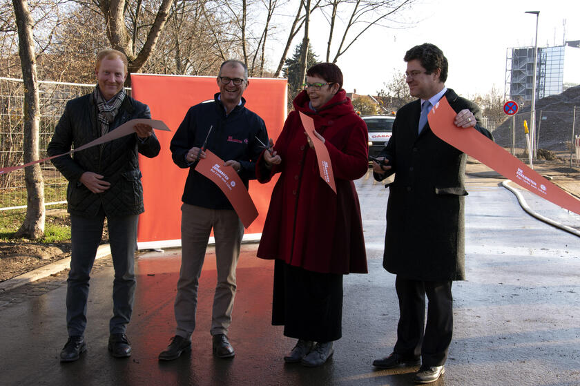 Bürgermeisterin und Beigeordnete der Stadt Erfurt Anke Hofmann-Domke und der Landesvorstand der Johanniter-Unfall-Hilfe e.V. Sachsen-Anhalt – Thüringen, Christian Meyer-Landrut und Andreas Weigel, gaben den Weg frei und freuten sich über den erreichten Meilenstein. Nach 30 Wochen Bauzeit sind die AndreasGärten, eines der größten Bauprojekte der Johanniter, an alle Medien angeschlossen: 3600 Meter Stromkabel, 250 Meter Trinkwasserleitung, 700 Meter Entwässerung für Schmutz und Regenwasser sowie der Anschluss an die Fernwärme sind hierfür errichtet beziehungsweise verlegt worden.