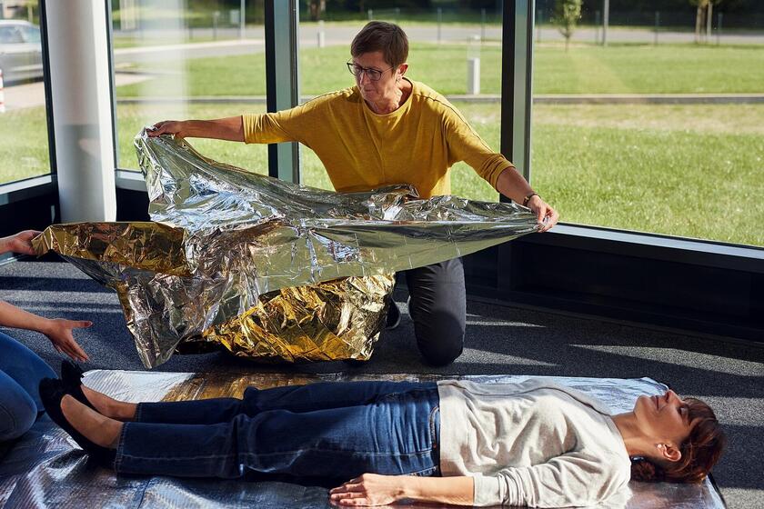 • Wunden versorgen: Offene Verletzungen steril abdecken und weitere Hilfe rufen.