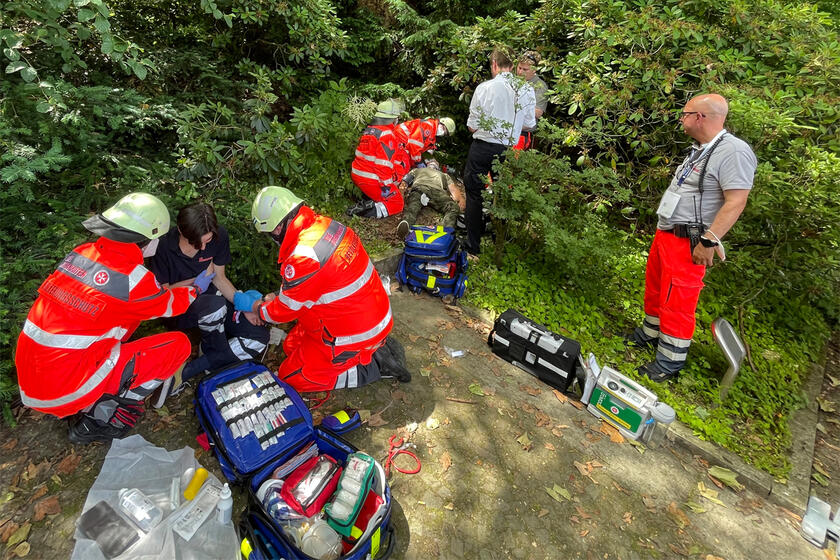 Der Landeswettkampf 2022 ist mittlerweile bei schönstem Sommerwetter in vollem Gange. 22 teilnehmende Teams aus ganz Nordrhein-Westfalen haben die schriftlichen Tests absolviert und stellen derzeit im Grugapark und in und um die Grugahalle an den Wettkampfstationen ihre Leistungsfähigkeit in Erster Hilfe unter Beweis. Geschminkte "verletzte" und "blutende" Darstellerinnen müssen auf die richtige Weise versorgt werden. Außerdem gilt es, einen Trageparcours zu absolvieren und an Übungspuppen die Herz-Lungen-Wiederbelebung zu demonstrieren.