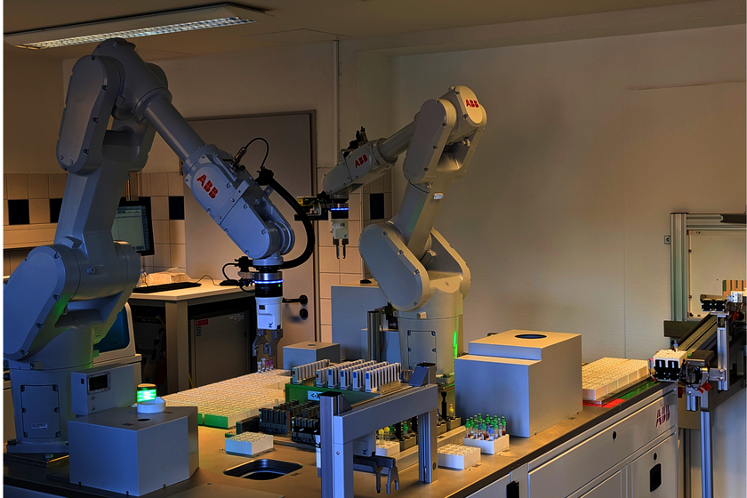 Das Herzstück des ABB-Lab Table II bilden zwei ABB-Industrieroboter vom Typ IRB 1300. Die beiden Roboterarme nehmen ab dem Blutprobeneingang zahlreiche Handgriffe ab. Ihre Armreichweite liegt bei 1,40 Meter.