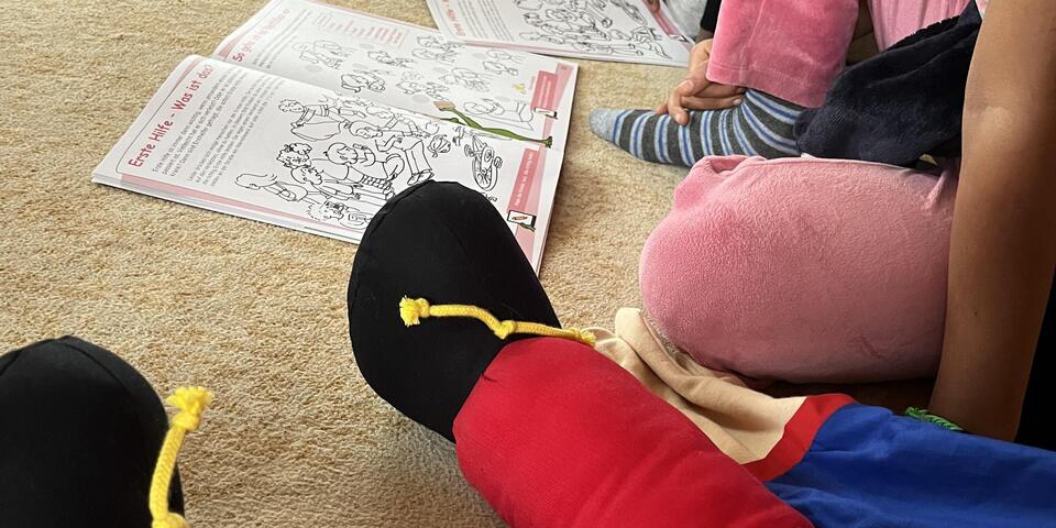 „Mit Rollenspielen, Rätselaufgaben und praktischen Übungen gestalten wir die Unterrichtseinheiten bunt und abwechslungsreich“, berichtet Lemke. Dabei werden die Kinder vom frechen Geschwisterpaar „Jona und Joni“ begleitet, die in der Ausbildung sogar als Handpuppen lebendig werden. Neben der europaweit gültigen Notrufnummer 112 lernen die Kinder, wie sie auch ohne ein Telefon Hilfe holen können. Auch Pflastertricks und das Anlegen von Verbänden üben die kleinen Ersthelfer.