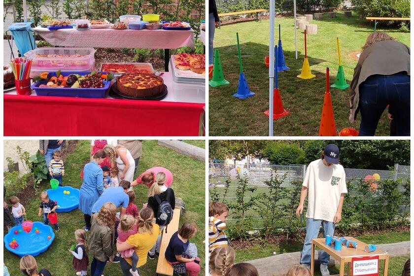 Für die Kinder gab es drei Stationen. Darunter waren Dosenwerfen, Bälle aus einem Planschbecken „fischen“ und ein Slalomlauf mit Stempelkarte. Bei letzterem konnten sich die Kinder einen Stempel abholen und bekamen dafür eine kleine Überraschung. Die Eltern sorgten für ein umfangreiches Buffet mit Kuchen, Salaten, Obsttellern und Fingerfood, sowie genügend Getränken.