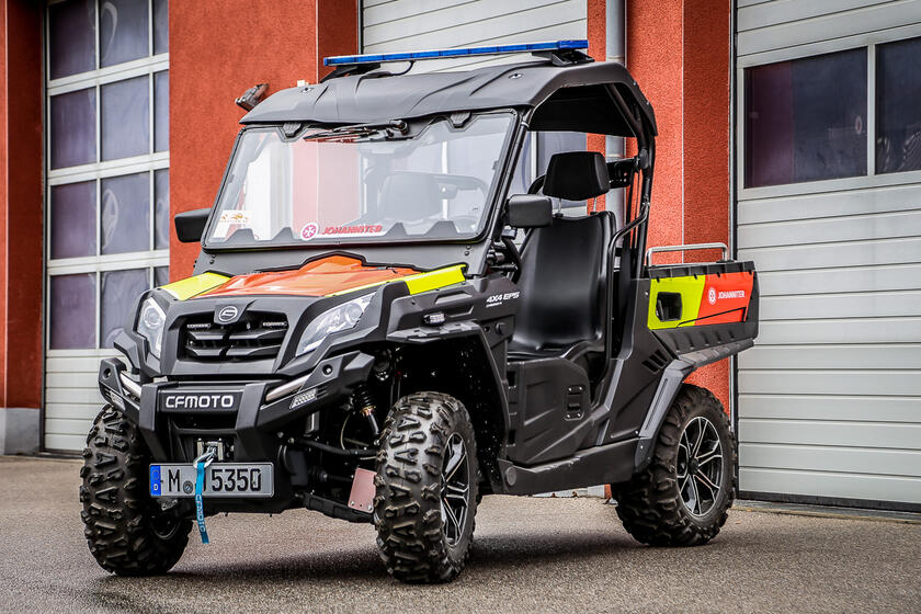 Daher haben die Johanniter aus Eigenmitteln Anfang 2023 ein Kleinlogistikfahrzeug des Herstellers CFMOTO beschafft. Das Modell UForce 800 ist 2,98 m lang, 1,43 m breit und verfügt über zwei Sitzplätze und eine kippbare Ladeplattform.
