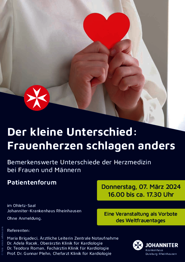 Es gibt bemerkenswerte Unterschiede in der Herzmedizin zwischen Frauen und Männern. Schleicht sich hinterrücks ein Herzinfarkt an, werden insbesondere bei Frauen die Symptome oftmals falsch eingeschätzt und können zum tödlichen Verhängnis werden. Denn diese sind bei den Geschlechtern sehr unterschiedlich. Über diese wichtigen Erkenntnisse informieren unsere Herzexperten im Rahmen eines Patientenforums am Donnerstag, 7. März 2024 im Ohletz-Saal.