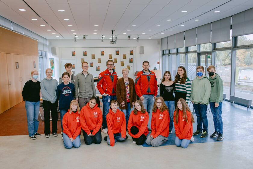 Stolz präsentieren die Schülerinnen und Schüler von der Erich-Klausener-Realschule am Aasee in Münster ihre leuchtend roten Pullis mit dem Schriftzug „Schulsanitäter“ auf der Rückseite. Sie haben sich als Team zusammengefunden um zukünftig den bestehenden Schulsanitätsdienst professioneller für ihre Schule zu organisieren und auszubauen, um die EKS noch sicherer zu gestalten. Denn bei Sportveranstaltungen, während den Pausen oder an Wandertagen stehen Schulsanitäterinnen und -sanitäter als kompetente Ersthelferinnen und -helfer bereit. „Von uns Johannitern lernen sie Notfallsituationen richtig einzuschätzen, zu trösten, einen Notruf abzusetzen und bei kleinen und größeren Verletzungen richtig zu reagieren“, so Daniel Nießen, Sachgebietsleiter Ausbildung bei den Johannitern.