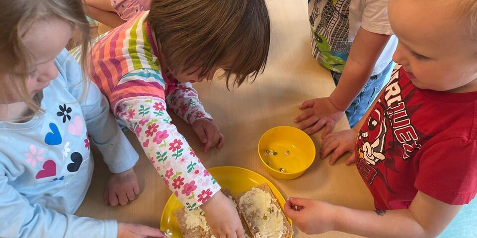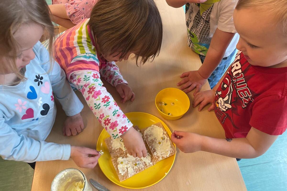 Unsere täglichen Kneipp-Anwendungen sind inzwischen fest im Kita-Alltag verankert. Ob Armbäder, Trockenbürstungen oder Luftbaden – die Kinder machen begeistert mit. Im Mai und Juni standen Heilpflanzen im Mittelpunkt: Die Bambis beschäftigten sich intensiv mit dem Gänseblümchen. Sie entdeckten die kleinen Blüten im Garten, hörten Geschichten, bereiteten Tee und Butter zu und gestalteten eine Gänseblümchenwiese. Ein Fingerspiel rundete das Erlebnis ab. Die Knirpse lernten den Löwenzahn kennen, sammelten Pflanzen im Garten, stellten Löwenzahnhonig her und experimentierten mit Stängeln – Naturwissenschaft und Genuss in einem!