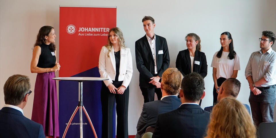 Udo Schröder-Hörster, Mitglied im Landesvorstand der Johanniter in NRW, und seine Regionalvorstandskollegen begrüßten am vergangenen Freitag im Deutschen Sport & Olympia Museum in Köln feierlich fünf neue dual Studierende. Am 1. August sind die jungen Kolleginnen und Kollegen in ihren Regionalverbänden und in der Landesgeschäftsstelle in eine Johanniter-Karriere gestartet. Sie absolvieren nun eine kaufmännische Ausbildung und studieren parallel an der FOM Management im Gesundheitswesen (B.A.)" oder "Business Administration (B.A.)".