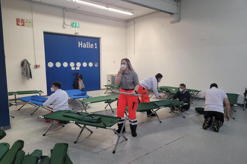 Nach Anforderung durch die Stadt Cottbus sind wir im Hilfeleistungseinsatz kommunale Unterstützung: Unsere Kameradinnen und Kameraden der SEE (SchnellEinsatzEinheit) Sanität Cottbus rückten vom Johanniter-Katastrophenschutzstandort Wache 3 direkt zur Messe Cottbus aus. Dort wird in zwei Hallen eine provisorische Unterkunft eingerichtet. Wir packen gemeinsam mit dem DRK Kreisverband Cottbus-Spree-Neiße e.V. an und bauen für die in Kürze ankommenden Geflüchteten Feldbetten im Akkord.
