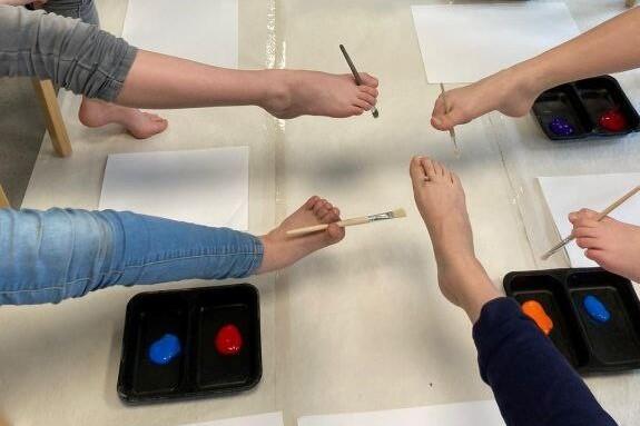 Die Hortkinder der Klassenstufen 2-6 durften sich an einer Fußmalerei versuchen und hatten großen Spaß dabei.