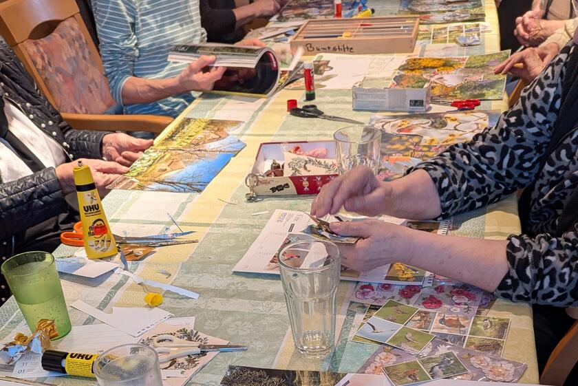 Die Themen boten viel Raum für persönliche Ideen und unterschiedliche Fähigkeiten. Unterstützt von einigen Helfenden konnten auch Menschen mit Seheinschränkung oder dementiellen Erkrankungen aktiv teilnehmen und eigene Erfolgserlebnisse erfahren. Die spirituellen Impulse und Bibeltexte von Pfarrerin Ulrike Schemann regten nicht nur zum Gestalten, sondern auch zum Erzählen persönlicher Geschichten an.
