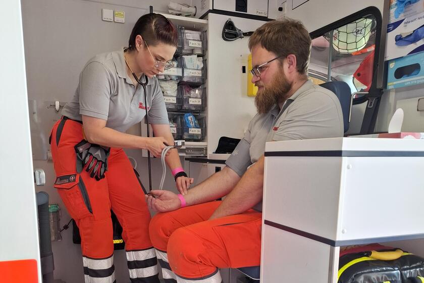 Zurück an der Wache richtete die Betreuungsgruppe eine Verpflegungsausgabe samt Essensbereich ein. Die Sanitätsgruppe baute eine Sanitätsstation auf und führte einen kurzen Gesundheitscheck bei allen durch – jetzt kennt jede*r den eigenen Blutdruck!