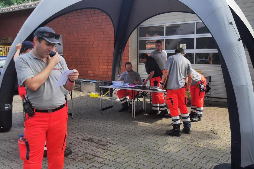 Ein Teil der Einsatzkräfte fuhr danach zurück zur Wache, um eine Registrierungsstelle aufzubauen. Parallel errichteten DRK und Johanniter zwei Verpflegungsmodule – mit dem Ziel, im Ernstfall bis zu 500 Personen verpflegen zu können.
