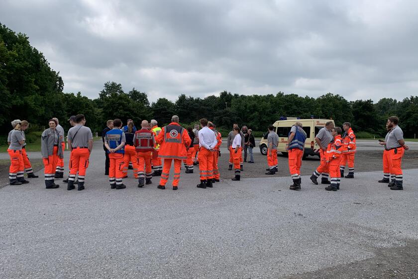 Los ging’s pünktlich um 9 Uhr an der Wache 72 in Bielefeld-Ummeln. Nach einer kurzen Sicherheitseinweisung fuhren wir mit Blaulicht und Martinshorn zum Bereitstellungsraum am Gleisdreieck. Dort trafen wir auf den Verpflegungstrupp und eine Betreuungseinheit des DRK Senneraum.