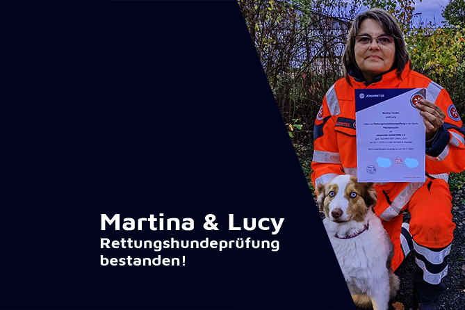 Am 5. November war es wieder so weit: Für viele Rettungshundeteams der Johanniter stand am ersten Wochenende die Rettungshundeprüfung an. Auch Staffelmitglied Martina Tenten und ihre Hündin Lucy machten sich auf den Weg nach Gießen und bewiesen absolut ruhige Nerven bei der Prüfung. Begleitet und unterstützt wurde sie von ihre sehr erfahrenen Staffelkollegin Heike Trautmann.