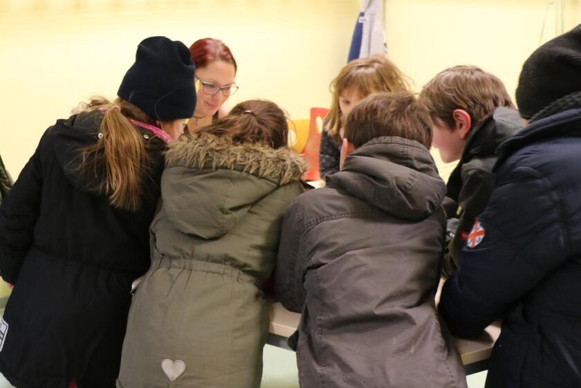 Obwohl es kalt und windig ist, flitzen die Kinder der Johanniter-OGS in Lügde über den Schulhof, suchen in Büschen nach Hinweisen und rufen ihren Schulfreunden Begriffe wie „blau“ oder „Schneeball“ zu. In den Innenräumen der Offenen Ganztagsschule der St. Marien Grundschule geht es genauso geschäftig zu. Fünf Jungen bauen aus Pappkartons und Mullbinden in Windeseile einen Schneemann, eine Mädchengruppe stimmt gerade „Schneeflöckchen, Weißröckchen“ an während sich in zweiter Reihe eine Gruppe kaum gedulden kann, den Würfel zu werfen.