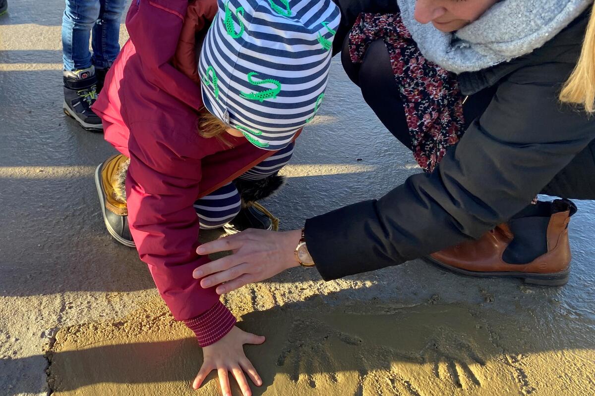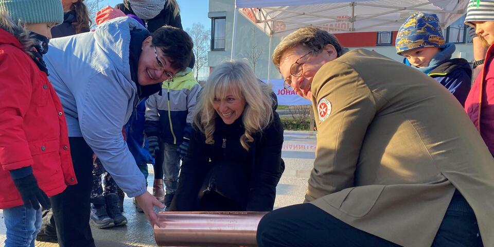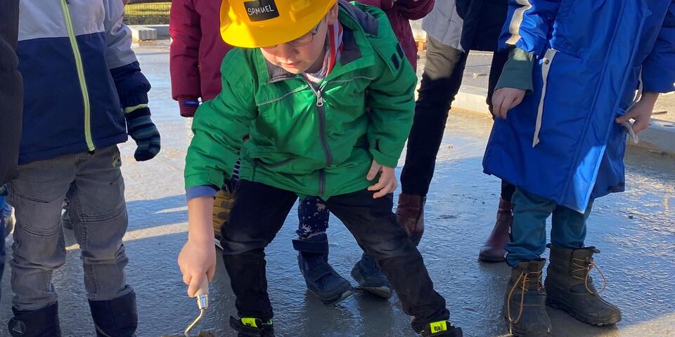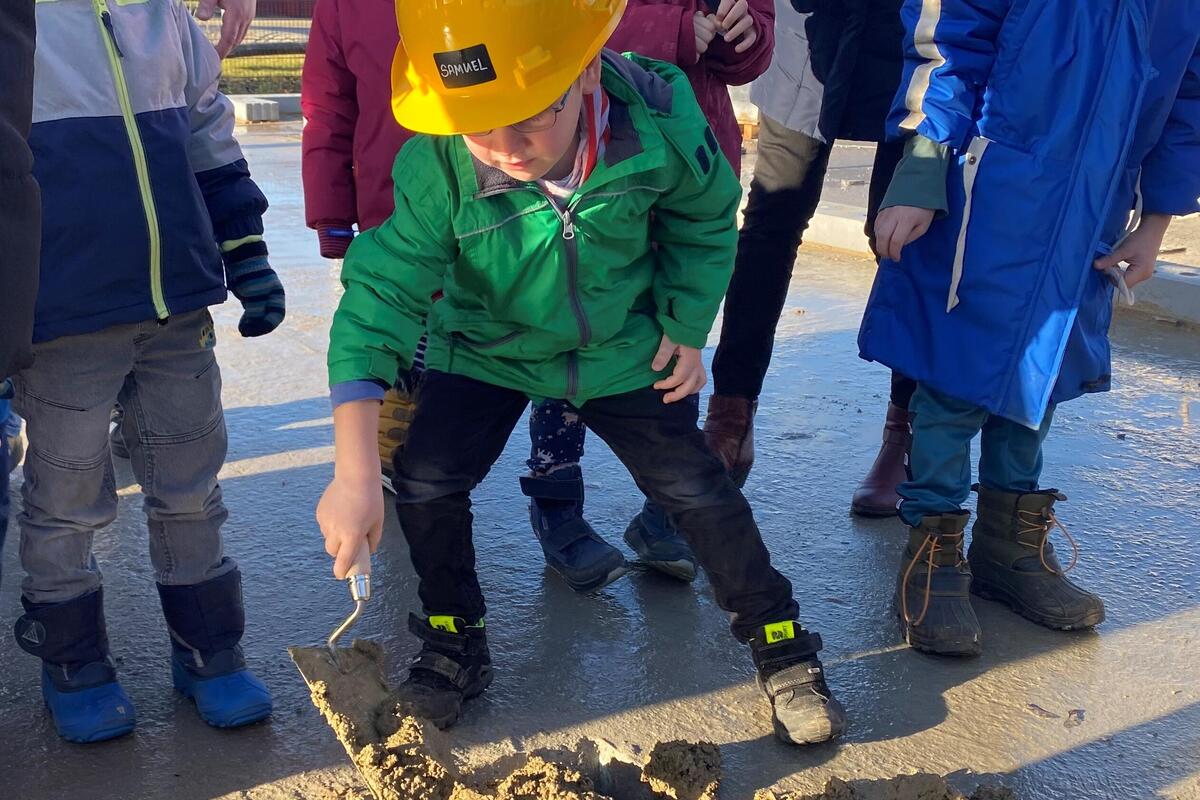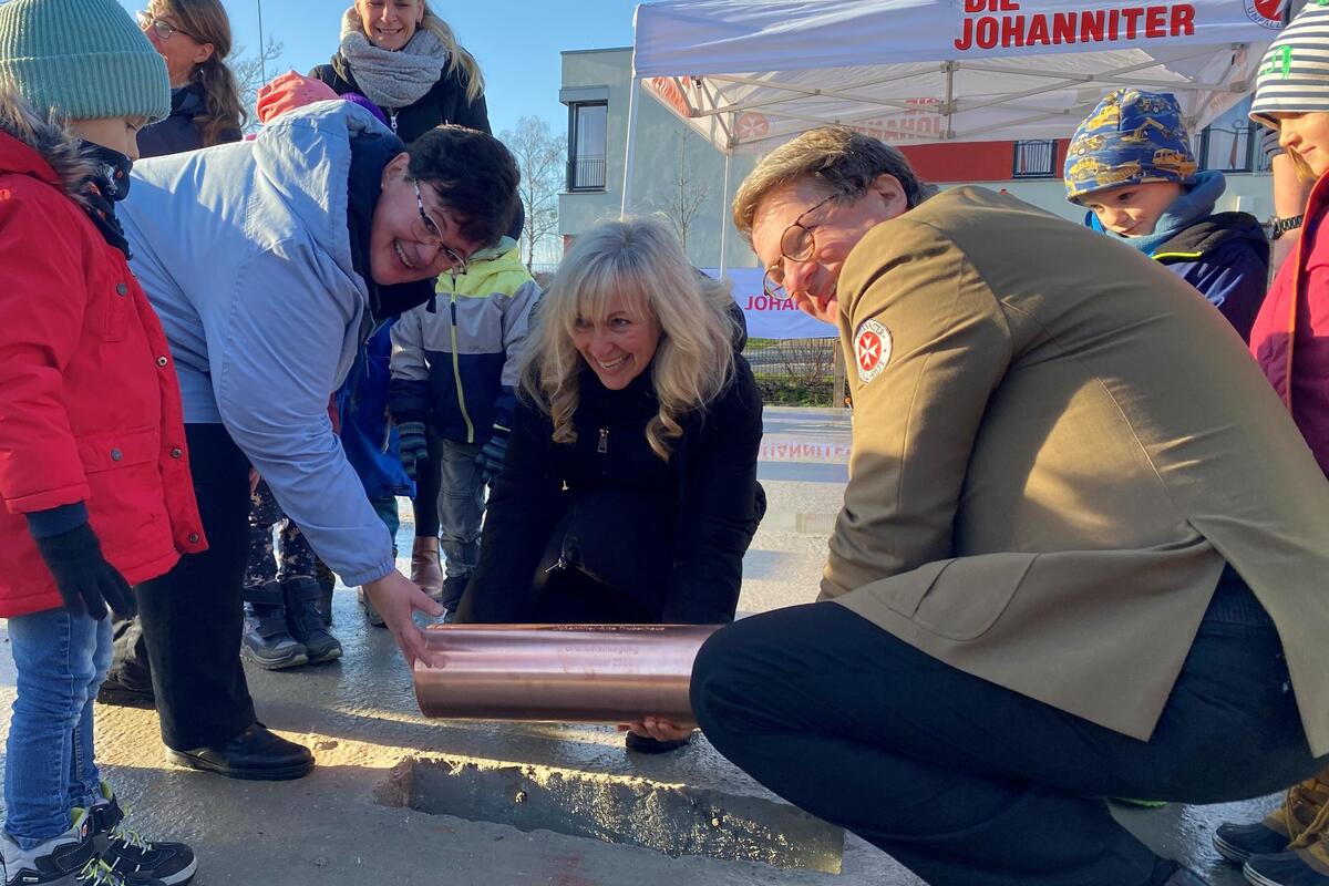 Pünktlich um 11 Uhr kam die Sonne hinter den Wolken hervor und wärmte die knapp 30 Gäste, die sich auf der Grundplatte am René-Iskin-Ring versammelt hatten. Nach der Begrüßung durch Dietrich von Buch, ehrenamtliches Vorstandsmitglied im Regionalverband Nordbrandenburg, folgte ein Grußwort der stellvertretenden Bürgermeisterin der Gemeinde Wandlitz, Ilka Paulikat. Sie wünschte alles Gute für die Bauarbeiten, die erfolgreich vorangehen. Denn neben der Bodenplatte sind bereits die Grundleitungen verlegt und erste Wände lassen den Grundriss der entstehenden Kindertageseinrichtung erkennen. Anschließend sangen die Kinder der benachbarten Johanniter-Kita „Trubelhaus“ ein Ständchen und freuten sich, dass es dann endlich ans „Handwerken“ ging. Die Kupferschatulle, die mit der aktuellen Ausgabe der MOZ, Münzen, Bildern der Kinder und den Bauplänen der Kita befüllt war, wurde in einer Aussparung in der Bodenplatte versenkt. Die 3-6-Jährigen durften das Loch dann mit Beton füllen und anschließend ihre Handabdrücke verewigen.