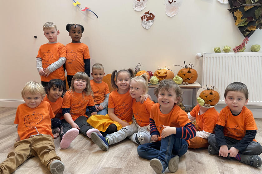 Was ist das für ein Anblick! Wohin man guckt, alles Orange. Nicht nur die ErziehrInnen der Johanniter-Kita Campus in Cottbus tragen zur Zeit diese modische Farbe. Auch die Kinder erschienen gestern (fast) alle in orangefarbenen T-Shirts. Jedes Kind hatte sogar seinen Namen unter dem zauberhaften Kürbisbild. Stolz waren die Kleinen, brüllten laut "Halloween" und zeigten die feinsten Gruselgrimassen.