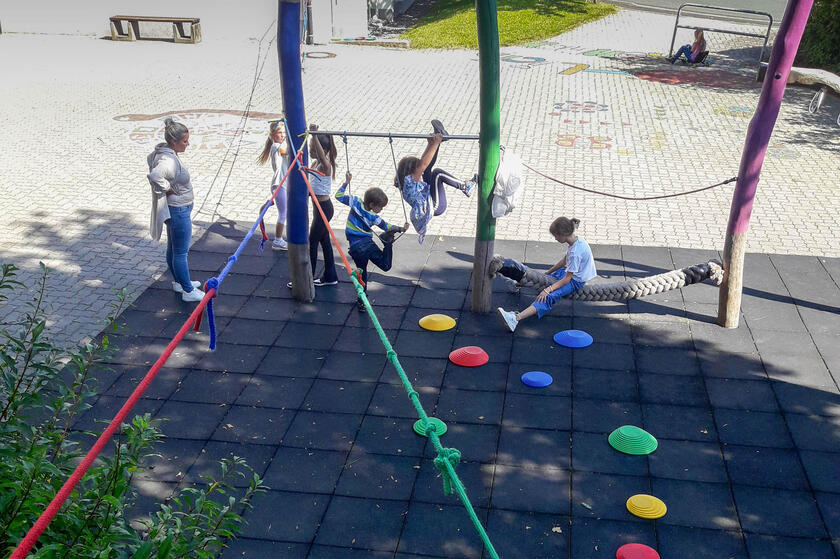 Genutzt wurde natürlich auch das immer noch schöne Wetter im September: Aus vielen bunten Seilen bauten die kleinen Künstler eine Seilbahn, die über den ganzen Pausenhof reicht - super zum Bewegen und Spielen.