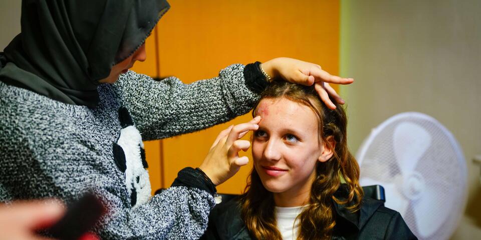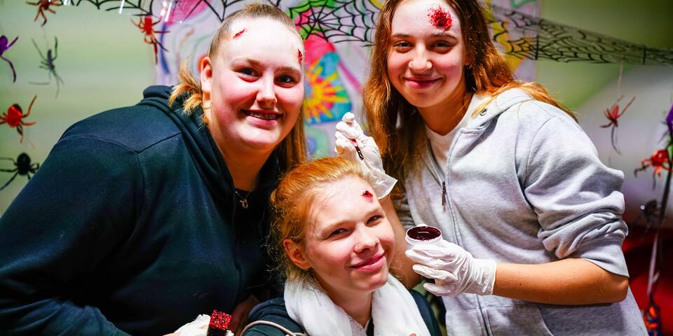 Rund 30 Kinder folgten begeistert der Einladung und freuten sich riesig. Sie starteten mit einem Schminkworkshop. Das Johanniter-Team stand mit Latexmilch, Kunstblut und jeder Menge Tipps und Tricks parat. Schließlich werden solche Wunden normalerweise für Unfallübungen vom Team RUD („Realistischen-Unfall-Darstellung) geschminkt. Die Gäste waren begeistert, wie echt ihre Verkleidung nach dem Schminken wirkte.