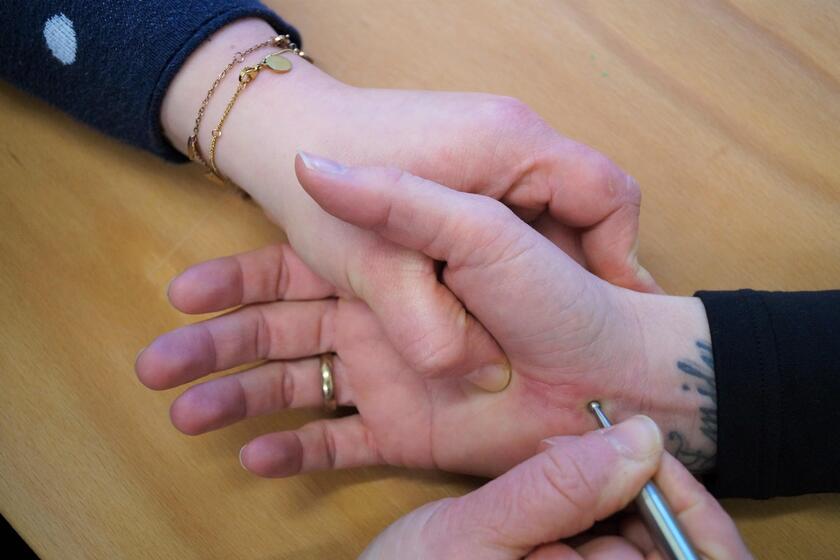 Dabei helfen spezielle Hilfsmittel, wie hier der Narbenstick, um auch tiefer liegende Gewebeschichten gezielt erreichen und mobilisieren zu können. Durch die Kombination aus passiven Mobilisationsmethoden und einem aktiven Neulernen physiologischer Bewegungsabläufe ist eine nachhaltige Verbesserung der Symptomatik zu erreichen.