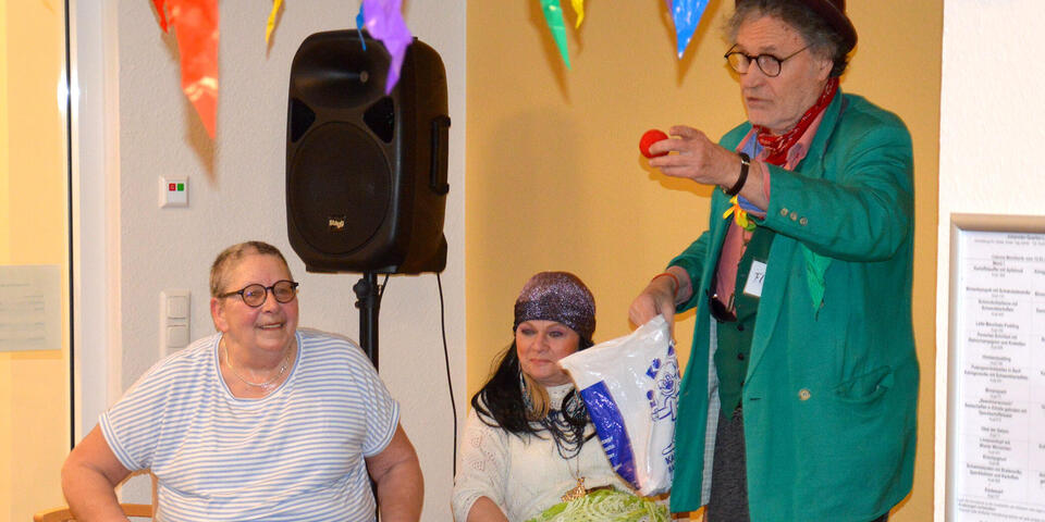 Wie geplant startete um 14.30 Uhr die Party. Kaffee und Kuchen wurde ausgeschenkt und im Saal ertönte auch schon Partymusik. Gut gelaunt empfingen die Bewohnerinnen und Bewohner den Clown Flummi, der mit viel Spaß das Publikum begeisterte und in seinen Bann zog.