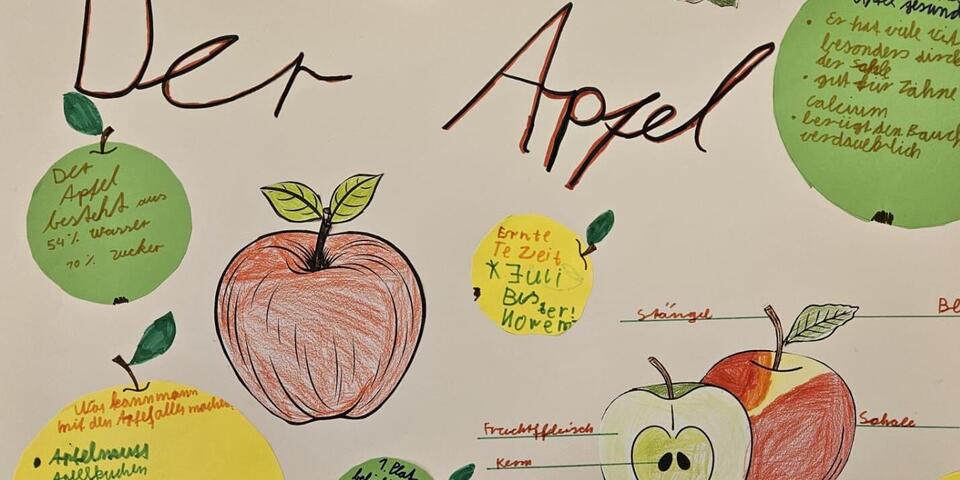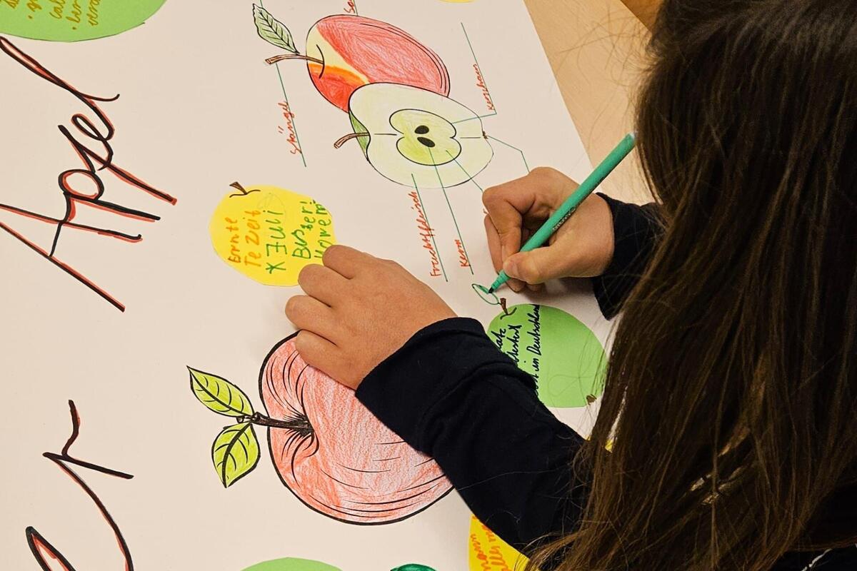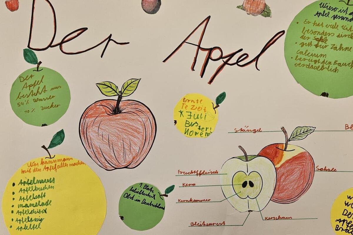 Im Anschluss erarbeiteten die Hortkinder gemeinsam ein Arbeitsblatt und gestalteten ein großes, farbenfrohes Plakat rund um das Thema Apfel. Zum Abschluss der Projektwoche wurde es dann richtig lecker: Aus frischen Äpfeln zauberten die Kinder Apfelringe im Blätterteig mit Vanillesoße – ein süßer Höhepunkt, der allen schmeckte.