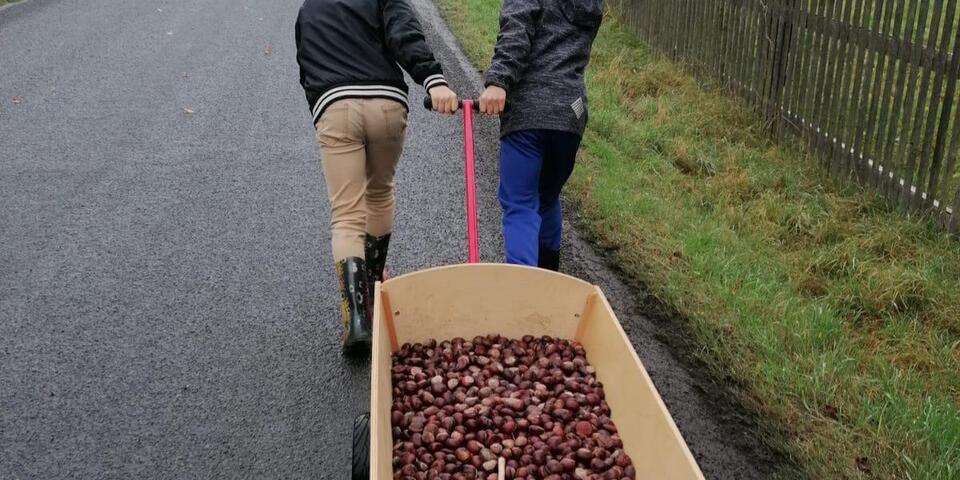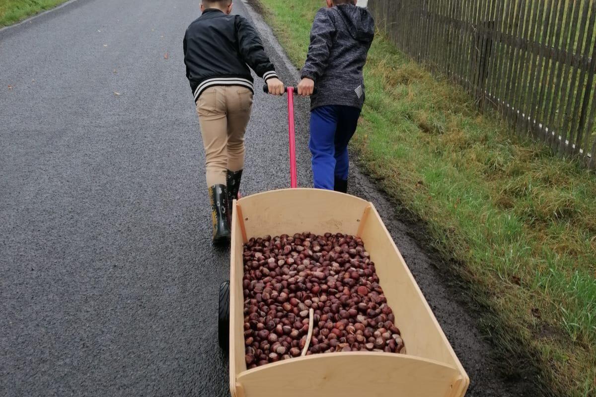 Die zweite Ferienwoche startete aktiv. Fleißig sammelten die Hortkinder Kastanien im Garten, um sie anschließend gemeinsam zum Hirschgehege im Ort zu bringen. Mit vereinten Kräften und einem gut gefüllten Bollerwagen meisterten sie den Weg – sogar der Regen konnte sie nicht aufhalten. Der Ausflug wurde zu einem echten Gemeinschaftserlebnis.