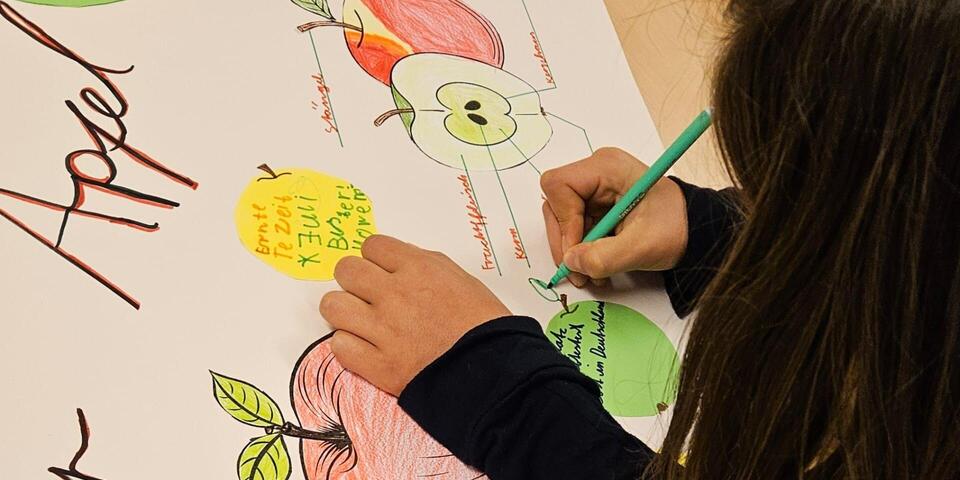Die Kinder gingen der Frage auf den Grund, wie ein Apfel eigentlich aufgebaut ist, und untersuchten das Obst ganz genau. Natürlich durfte dabei auch kräftig probiert werden!