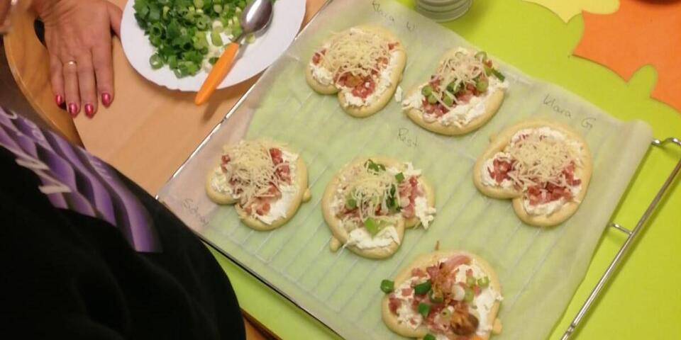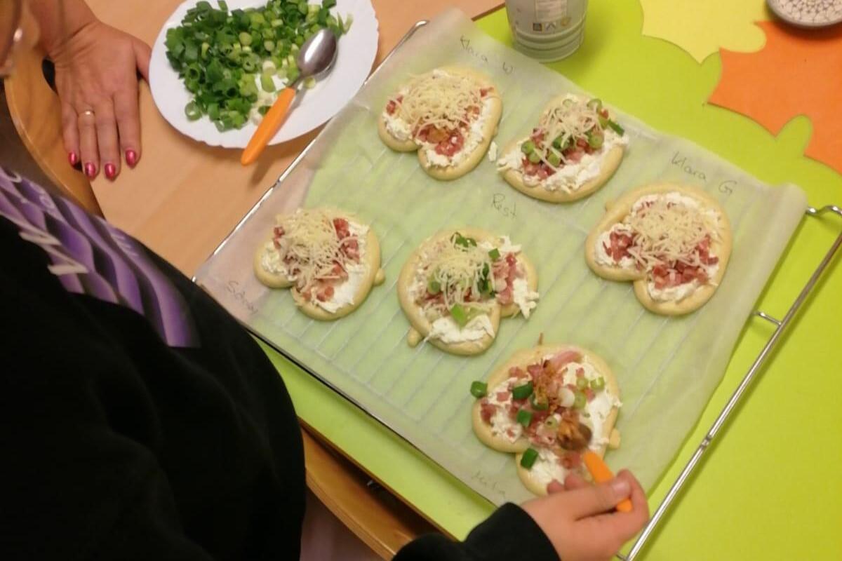 Mit Schmand, Frischkäse und Reibekäse wurde eine leckere Masse angerührt, die auf Brezeln verteilt und anschließend individuell belegt wurde. Ob mit Frühlingszwiebeln, Schinkenwürfeln oder mutig mit Chiliflocken – jede Brezel war ein Unikat! Nach kurzer Zeit im Ofen waren die überbackenen Brezeln fertig und sorgten für strahlende Gesichter.