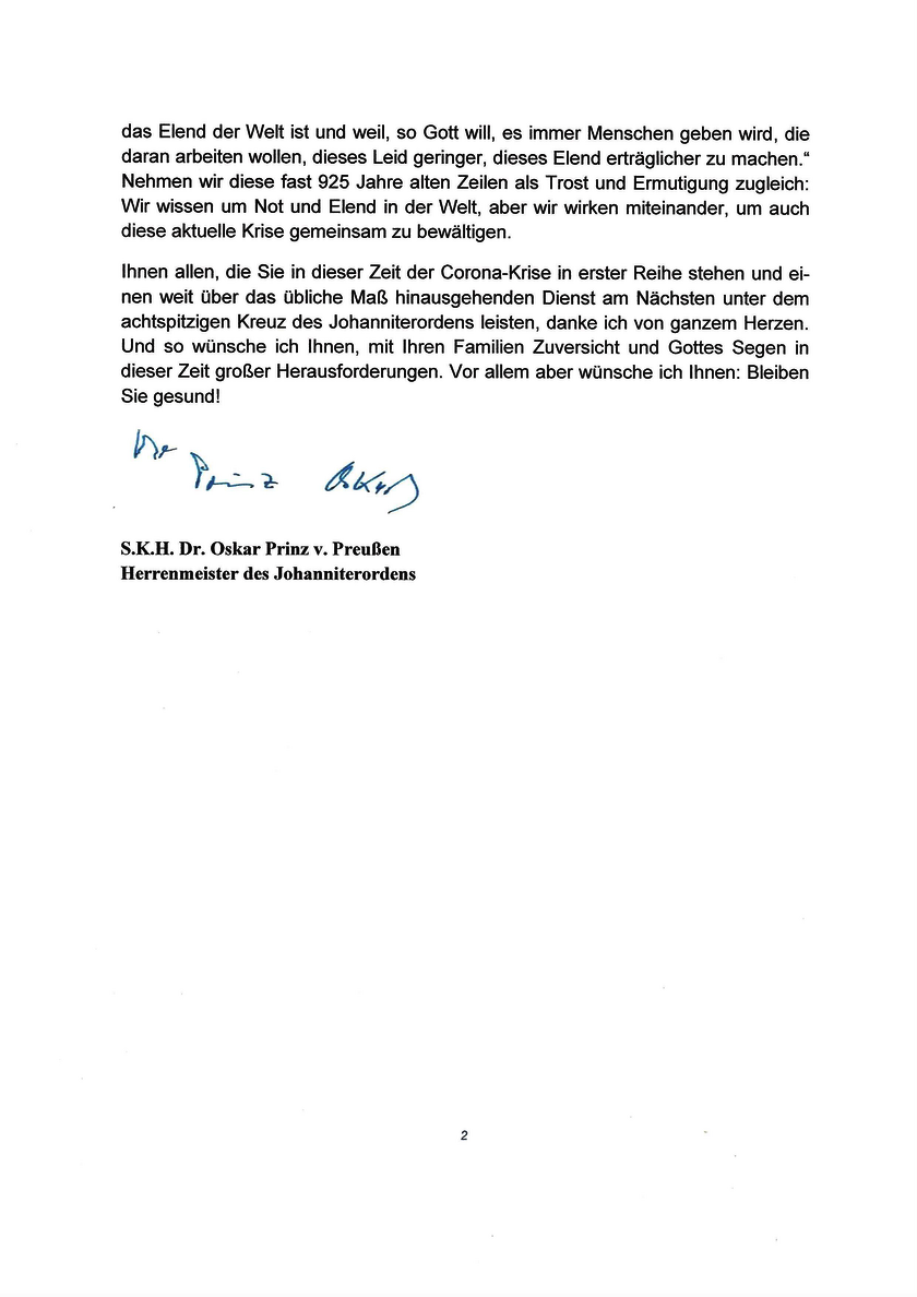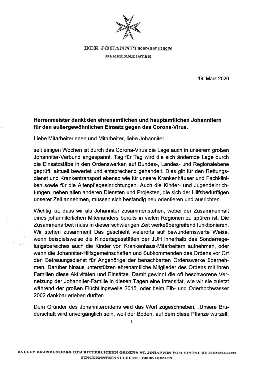 19.03.2020 | Johanniterorden Generalsekretariat Herrenmeister dankt für Einsatz gegen das Corona-Virus Der Herrenmeister des Johanniterordens dankt ehrenamtlichen und hauptamtlichen Johannitern