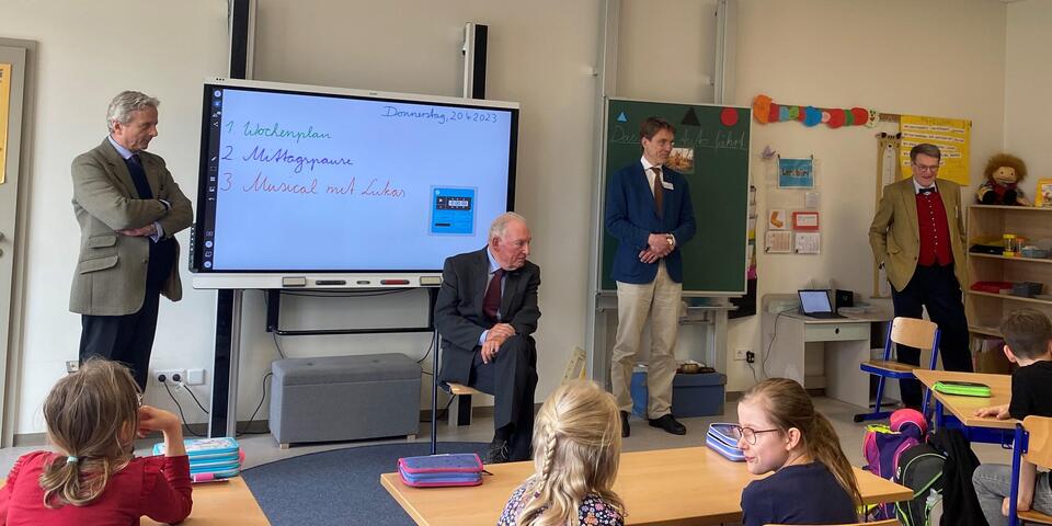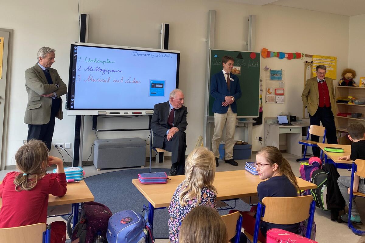 In Begleitung der Landesvorstandsmitglieder David Kreuziger und Götz-Georg von Randow wurden sie in der Geschäftsstelle von den Regionalvorständen Ralf Opitz und Dietrich von Buch sowie vom Barnimer Landrat Daniel Kurth und dem Eberswalder Bürgermeister Götz Herrmann begrüßt. Anschließend besichtigten die Gäste die Kinderakademie, die Grundschule, Hort und Kindergarten unter einem Dach vereint. Nach einer kleinen Aufführung der Theater-AG, die einen Teil ihres Osterstücks vorführten, ging es in die Klasse 2a, die viele Fragen an den Prinzen hatte.