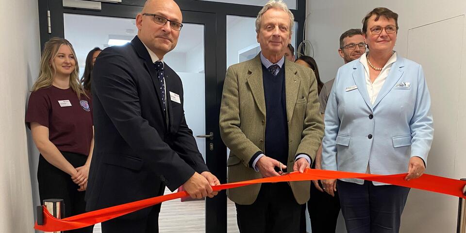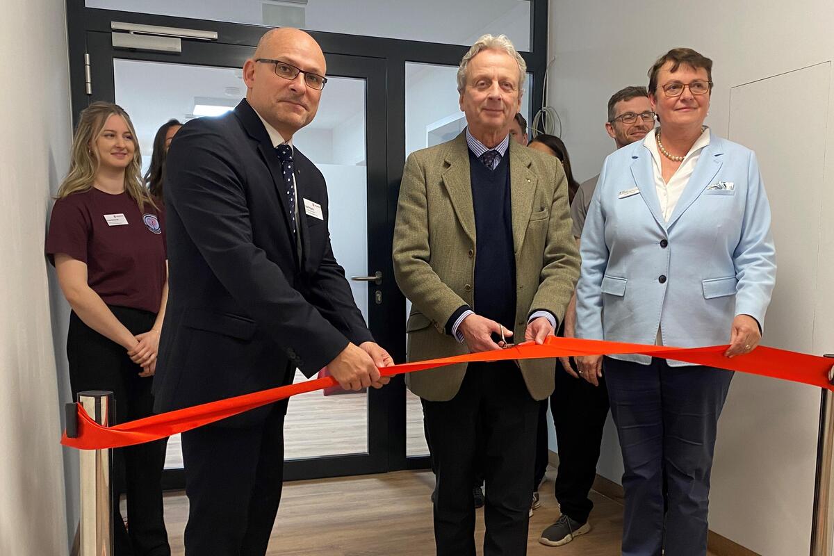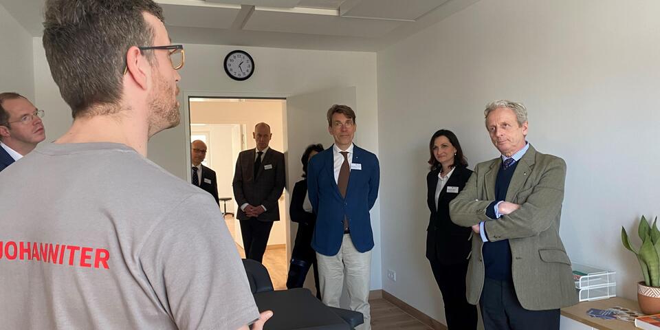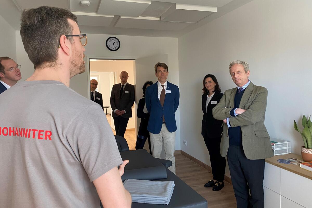 Die symbolische Eröffnung der 450 Quadratmeter großen Therapiepraxis im ersten Obergeschoss des neuen Johanniter-Quartiers war ein weiterer Höhepunkt des Besuchsprogramms. Die Gemeinschaftspraxis "Johanniter-Therapiezentrum am Weidendamm" bündelt Angebote der Logopädie sowie der Physio- und Ergotherapie. Neben sechs Behandlungsräumen gehört ein großzügiger Sport- und Bewegungsraum für Präventionskurse und Gruppentherapien zur Praxis.