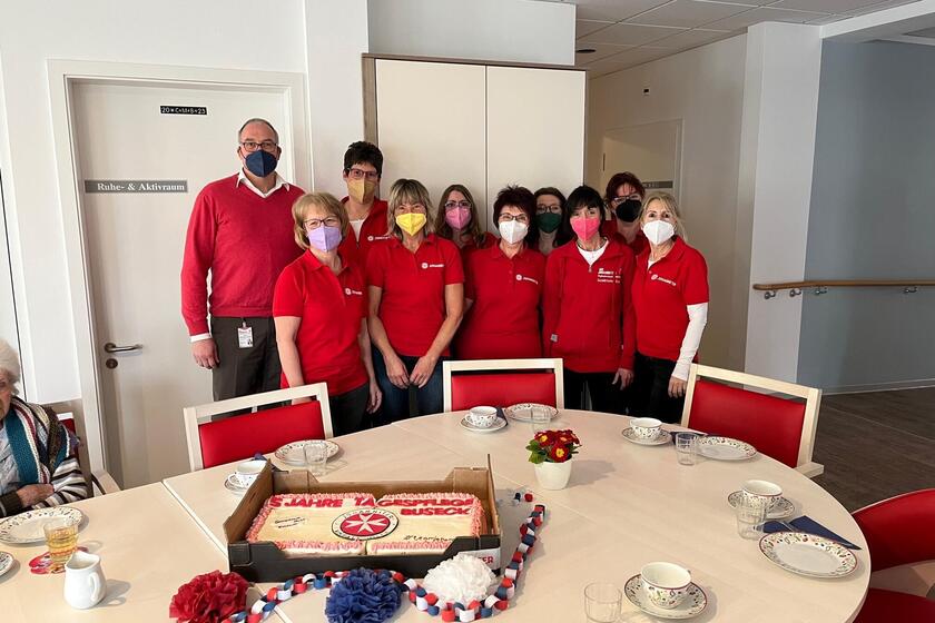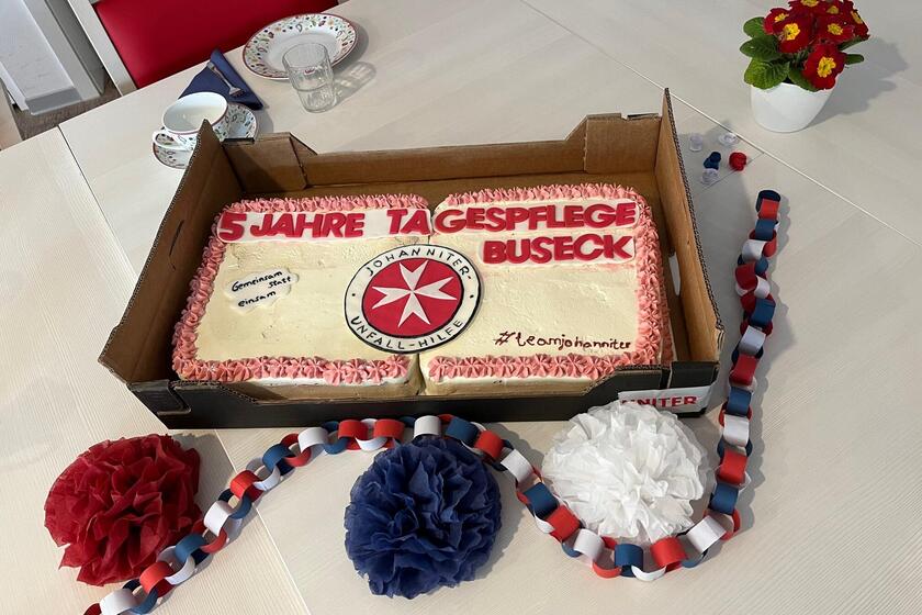 Großen-Buseck. Heute auf den Tag vor 5 Jahren, am 06. März 2018, hat der Regionalverband Mittelhessen seine Tagespflege Buseck in der Kaiserstraße 24 in Großen-Buseck eröffnet. Ein schöner Anlass für Regionalvorstand Marco Schulte-Lünzum, dem Team und den Tagespflegegästen einen Überraschungsbesuch abzustatten. Zur Feier des Tages wurde eine große Motto-Torte gebacken, die sich zum Kaffee nun alle gemeinsam schmecken lassen können. „Herzlichen Glückwunsch und auf viele weitere gute Jahre!“