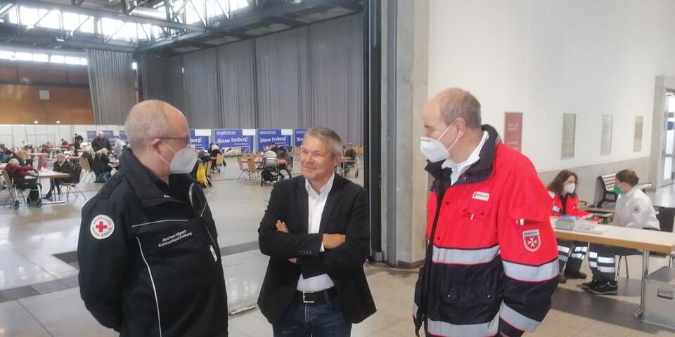 Vor Ort informierte sich auch der Freiburger Bürgermeister Stefan Breiter über den Einsatz und dankte den zahlreichen Helferinnen und Helfern für ihr ehrenamtliches Engagement. Bereits am Freitag zuvor waren die am Rettungsdienst und Krankentransport beteiligten Organisationen der Stadt Freiburg mit zahlreichen zusätzlichen Fahrzeugen im Einsatz, um bei der Evakuierung der Uniklinik zu unterstützen.