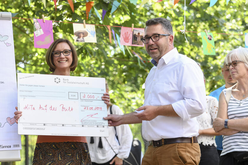 Nach der Rede überraschte sie Michael Homann, Dienststellenleiter des Ortsverbandes Hannover-Wasserturm mit den Worten „…wir möchten der Einrichtung, insbesondere auch den Eltern und den Kindern ermöglichen, auch diesen Garten selbst zu gestalten…“ und übergab einen Scheck in Höhe von 2000€ als Anfangsfinanzierung für die Bepflanzung der Außenanlage.