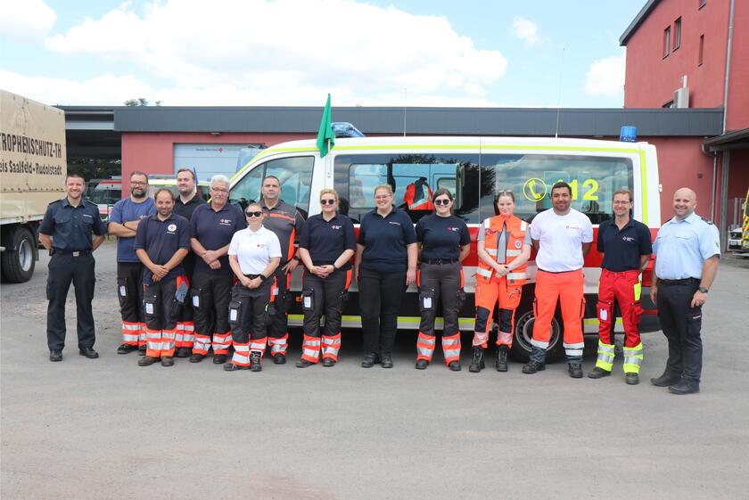 Auf dem Foto ist das Team aus dem Landkreis Saalfeld-Rudolstadt zu sehen, das sich am Montag zum Spiel Italien gegen Kroatien in die Messestadt aufmachte: Besatzungen für einen ETG, zwei Mannschaftstransportwagen und einen Rettungstransportwagen des DRK-Kreisverbands Saalfeld-Rudolstadt sowie einen Rettungstransportwagen uns.