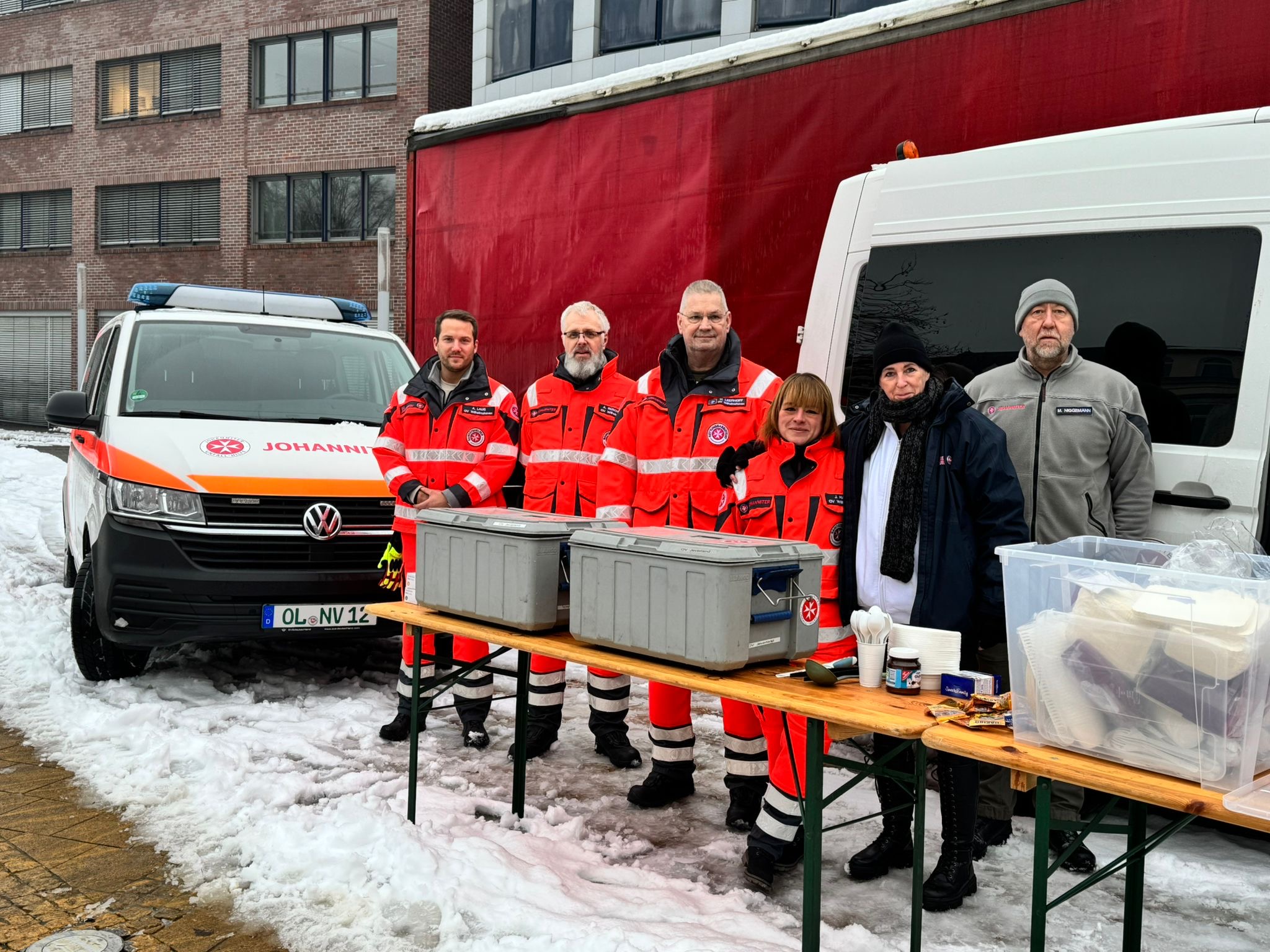 Das war schnell geschaltet. Da die winterlichen Witterungsbedingungen ganz besonders diejenigen trifft, die gar nichts mehr haben, keine Wohnung, kein Obdach, oft nicht ausreichend warme Kleidung und kein Geld, um sich etwas Warmes zu Essen zu kaufen, haben die Johanniter-Unfall-Hilfe e.V. Ortsverband Wilhelmshaven spontan eine Ausgabestation für heiße Suppe und Würstchen, Brot, Kaffee und Tee eingerichtet. Am Vormittag entstand in Reihen des Ehrenamtes die Idee, Obdachlosen und Bedürftigen zu helfen. Vorbild ist unter anderem der Oldenburger Kältebus. Dienststellenleiter Holmer Leerhoff schickte einige Kolleginnen und Kollegen zum Einkaufen. Ein Anruf bei der Polizei und die Genehmigung zum Aufbau auf dem Valoisplatz lag vor. Die Verpflegungsgruppe des Ortsverbandes Jeverland stellte ihre Thermophoren zur Verfügung, heiß gemacht wurde die Suppe in der Küche der Tagespflege „Die Insel“, für die die notwendigen Gesundheitsausweise vorliegen und die frei war, da die Gäste wegen der Straßenverhältnisse nicht kommen konnten. Um 15:30 Uhr waren die ehrenamtlichen Helferinnen und Helfer ausgabebereit. Obwohl der Termin nur schnell über die sozialen Medien angekündigt worden war, gab es einen großen Andrang. So groß, dass spontan beschlossen wurde, auch am Freitag und Sonnabend, 9. und 10. Januar, jeweils ab 15:30 Uhr die Ausgabestelle auf den Valoisplatz aufzubauen. Für Holmer Leerhoff kein Thema. „Wenn Hilfe benötigt wird, sind wir da. Da wird auch nicht groß geredet, sondern gemacht.“ Schnell im Notfall helfen ist nun einmal eine der vielen Stärken der Johanniter.