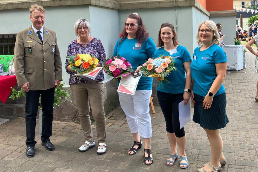 Das Jubiläumsfest startete mit einem Gottesdienst in der Laurentiuskirche, bei dem die Schulanfänger feierlich verabschiedet wurden. Nach einer offiziellen Begrüßung und Eröffnung des Festes durch Frau Hambuch und unserem ehrenamtlichen Regionalvorstand Dr. Johannis Körner, wurde im Garten der Villa an der Neumarktstraße ausgelassen gefeiert. Zu diesem Anlass wurden auch 4 Kolleginnen für ihre langjährige Tätigkeit bei den Johannitern geehrt. Vielen Dank an Frau Kathrin Zienau, Frau Katrin Lungwitz und Frau Ute Anders für je 30 Jahre und Frau Simon Richter für 25 Jahre Johanniterzugehörigkeit.