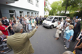Als der Ordenskanzler die Gäste nach draußen zur Enthüllung des Hausschildes bat, erlebten sie eine gelungene Überraschung der Johanniter Seniorenhäuser GmbH. Diese hatte alle Hebel in Bewegung gesetzt, um dem Johanniter-Stift zur Einweihung einen Kleinbus zu schenken. Der Johanniterorden und die Johanniter-Unfall-Hilfe e.V. (JUH) sowie eine Privatspende des Kuratoriumsvorsitzenden und der Förderverein des Johanniter-Stifts unterstützten die Verantwortlichen bei ihrem Vorhaben. Gerührt nahm Sieglinde Roicke den Autoschlüssel entgegen und freute sich für ihre Bewohnerinnen und Bewohner, die den Bus für Ausflüge und Besorgungen nutzen können.