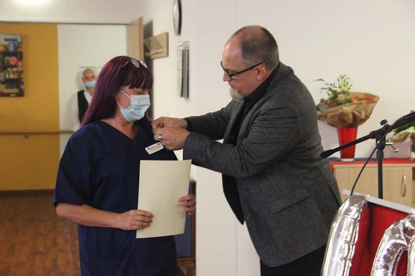 Auch Niederlassungsleiter Christian Umlauf bedankte sich für die letzten zehn Jahre: „Jeder Mitarbeitende, Ehrenamtliche, Angehörige, Bewohner und Besucher trägt seinen wertvollen Teil dazu bei, dass wir hier aus Liebe zum Leben die Gemeinschaft pflegen können.“ Er ehrte die Mitarbeitenden, die schon von Anfang an im Johanniter-Stift arbeiten. Der Haustechniker Ralf Storck, die Pflegehelferinnen Beate Gröschl und Bärbel Csoboth sowie die Reinigungskräfte von der CEBONA Tülay Tas und Gülenc Güler erhielten neben einer Urkunde, eine Nadel sowie einen Blumenstrauß.