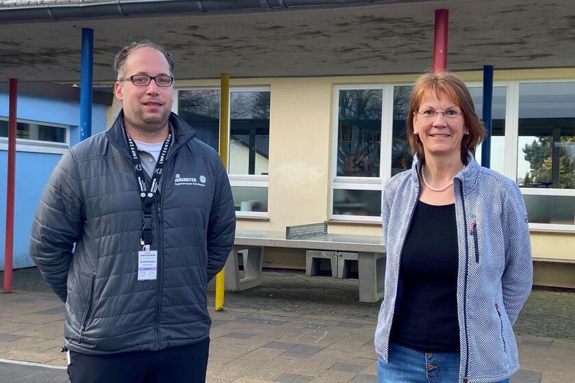BU: : „Schnelltest-Pate“ Björn Kohlhaussen (JUH) mit Schulleiterin Anette Glaum, Grundschule Annerod