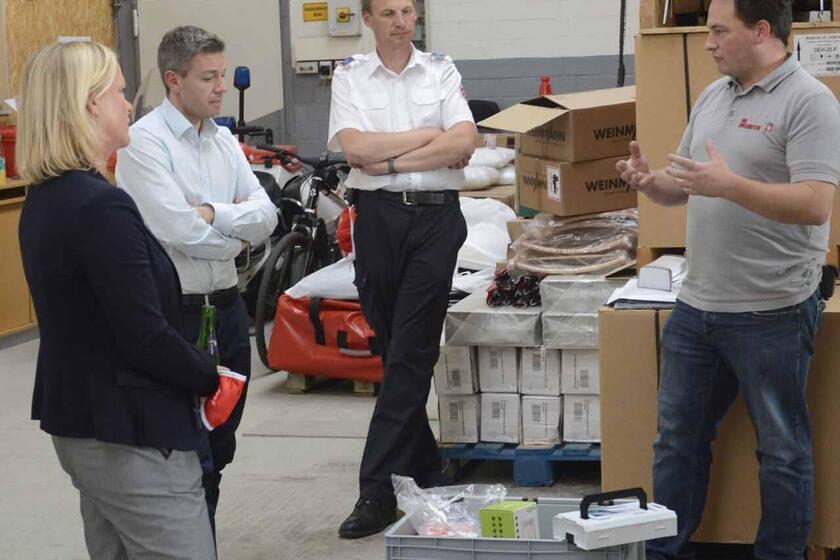 Die SPD-Politiker, neben Kurku waren Karsten Becker, Sprecher für Polizeipolitik, Rüdiger Kauroff, Sprecher für Feuerwehren, die sportpolitische Sprecherin Dunja Kreiser und der innenpolitscher Sprecher und Arbeitskreisvorsitzender Uli Watermann sowie der parlamentarischer Referent der SPD-Landtagsfraktion Christopher Finck und Daniel Fleer, Praktikant der SPD-Landtagsfraktion, befinden sich zurzeit auf Besuchsreise bei verschiedenen Einrichtungen von Polizei, Feuerwehr, Hilfsorganistionen und Katastrophenschutz. In Delmenhorst wurden sie empfangen von Oberbürgermeister Axel Jahnz, Marcel Colter und den ehrenamtlichen Helfern Sven Köster, Claus Hartmann und Fabian Kaczmarek. Neben der Vorstellung der Stresskisten und des Ortsverbands Delmenhorst mit dem Logistikzentrum Weser-Ems wurde aber auch Tacheles geredet. „Wir wünschen uns eine Ausweitung der Lohnfortzahlung für Einsatzkräfte bei Einsätzen unterhalb der Katastrophenschutz-Schwelle auch für Mitarbeitende der Hilfsorganisationen“, sagte Colter. Im Gegensatz zu den Kameradinnen und Kameraden der Freiwilligen Feuerwehren haben Retter der Johanniter-Unfall-Hilfe (JUH) sowie der anderen anerkannten Hilfsorganisationen bisher keinen Anspruch auf Lohnfortzahlung beziehungsweise deren Arbeitgeber auf Ausgleich der Lohnkosten. Dies umfasse auch die Befreiung von der Verpflichtung zur Arbeitsleistung nach nächtlichen Einsätzen. Colter selber hat das Problem nicht. „In Delmenhorst gibt es eine kommunale Lösung. Die Stadt hat die Übernahme der Lohnkosten bei Einsätzen der Retter zugesagt.“ Das gelte für alle Hilfsorganisationen. „Wir wissen, wie wichtig der Einsatz der Retter neben der Feuerwehr ist“, sagte Oberbürgermeister Jahnz.