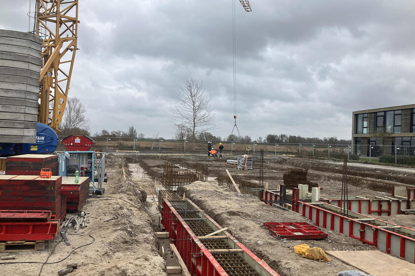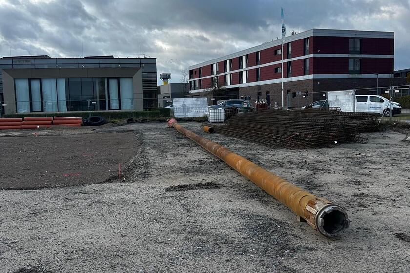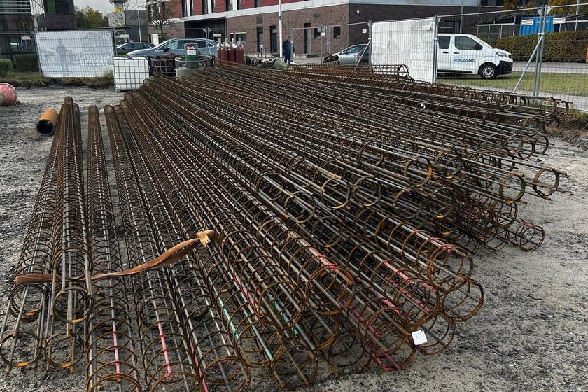 Wenn die Löcher für die Pfahlgründung gebohrt sind, werden die Stahlkörbe eingeführt und die Löcher danach mit Beton verfüllt.