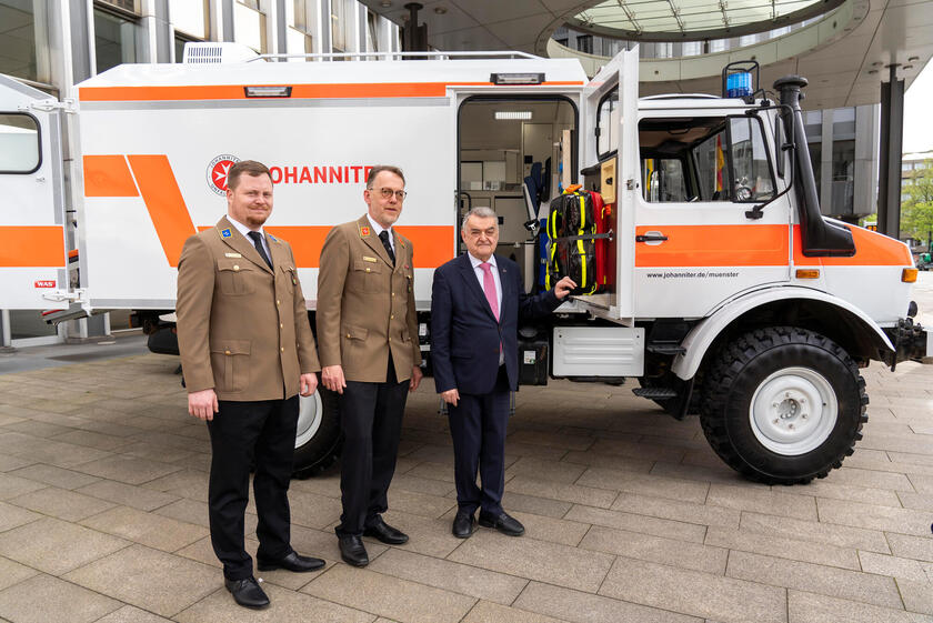 Johanniter-Landesvorstand Udo Schröder-Hörster, Peter Tuppeck (Präsidiumsmitglied und Regionalvorstand im Regionalverband Essen) und Julian Müller (Regionalvorstand im Regionalverband Bonn/Rhein-Sieg/Euskirchen) haben NRW-Innenminister Herbert Reul heute in Düsseldorf zwei Spezialfahrzeuge der neu konzeptionierten Katastrophenschutz-Einheit für den Einsatz in schwer zugänglichen Gebieten präsentiert: der Rettungswagen-Unimog und das Drohnen-Fahrzeug sind Teil der neu konzeptionierten "Universellen Katastrophenschutz-Einheit (UNIKE)" der Johanniter in NRW. Die UNIKE ist eine landesweit einsetzbare, dezentrale Einheit mit modularem Aufbau, die bestehende Strukturen im Rettungsdienst und Katastrophenschutz bei Extremwetterereignissen unterstützt. Mit den geländegängigen Fahrzeugen können die Helferinnen und Helfer auch bei Schneechaos oder Überschwemmungen Menschen dort retten, versorgen und betreuen, wo normale Fahrzeuge längst nicht mehr durchkommen.