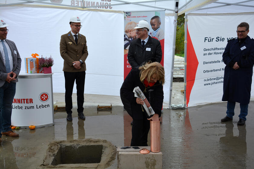 Unter Einhaltung der Corona-Regelungen wurde gemeinsam die Kupferkapsel versenkt. Darin zu finden sind Zeichnungen der Kinder aus dem Übergangswohnheim Nauen mit guten Wünschen für den Neubau, das aktuelle Amtsblatt der Stadt Nauen, Baupläne des Objektes und etwas Kleingeld. Manuel Meger, der Bürgermeister der Stadt Nauen, wünscht zu diesem Anlass weiterhin gutes Gelingen und viel Erfolg bei der Umsetzung des Projektes. Er ergänzt: „Bereits jetzt freue ich mich darauf, die leuchtenden Augen der mit Sicherheit neugierigen Kinder zu sehen, wenn Sie das mit Liebe und Feingefühl entstandene Gebäude betreten werden.“