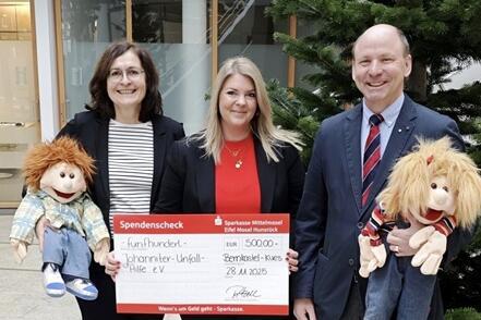 „Trauer ist ein sensibler Lebensabschnitt, gerade für junge Menschen. Wir freuen uns, dass wir mit unserer Spende dazu beitragen können, dass die Johanniter noch mehr qualifizierte Begleitung und sichere Anlaufstellen bieten können“, erklärt Kathrin Pitzen (Mitte), Geschäftsstellenleiterin Bernkastel-Kues, dabei. Ehrenamtliche, die Trauergruppen gestalten, brauchen Fortbildungen, um Traumatisierungen begegnen zu können. „Oder es braucht Material, um das Eis zu brechen und die Kinder mit ihren Gefühlen in Kontakt zu bringen“, erläutert Henning Otterson, der exemplarisch große Handpuppen mitgebracht hat: „Mit denen können die Kleinen oft ganz anders reden“. Die Referentin des Sparkassen-Vorstandsstabs Bettina Pellio betont: „Der Einsatz der Johanniter-Unfall-Hilfe für die Gesundheit und Sicherheit der Menschen in unserer Region ist unverzichtbar. Mit unserer Spende möchten wir einen Beitrag dazu leisten, dass noch mehr Menschen von ihrer wichtigen Arbeit profitieren können“. Kontakt: www.johanniter.de/lacrima-trier // Tel. 0651-27090-329