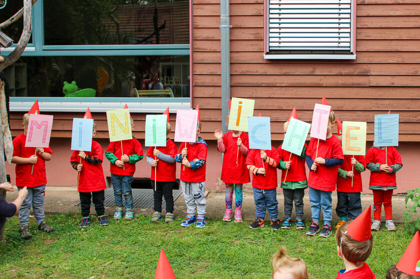 Durch die Teilung wurde auch ein neuer Name für das Haus 1 gesucht, denn Haus 2 bleibt die „Wichtelburg“. Es gab vier Vorschläge und die Kinder wählten ihren Favoriten“, verrät Michelle Schwanz. Sie ist die neue Leiterin des Krippenbereichs und seit zehn Jahren als Erzieherin im Haus tätig. Als Wichtel verkleidet präsentierten die Kleinen am Mittwoch ihren Siegernamen mit großen Buchstabenschildern: „Miniwichtel“. Bis zu 48 Miniwichtel haben im Haus Platz, 33 sind es aktuell.