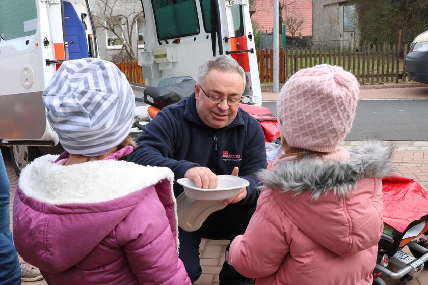 Im Rahmen des Kita-Projekts „Krankenhaus, Ärzte, Sanitäter und Notfälle“ waren Hakan Tasköprü, Desiree Dohmann und Ivonne Schmerein vom Johanniter-Ortsverband Beverungen mit einem Krankentransportwagen und einem Einsatzbulli angereist. Die Besichtigung des Krankenwagens gepaart mit spannenden Geschichten rund um Blaulicht, Notärzte und Sanitäter gehörte für die Kinder zum Highlight des Tages. Anschließend erlernten die Jungen und Mädchen in praktischen Übungen den Notruf zu wählen, Pflaster zu kleben und einen Verband anzulegen. Dabei versorgten sie sich gegenseitig mit Verbänden um Arm und Kopf und vergaßen bei der „Erstversorgung“ auch ihre Erzieherinnen nicht.