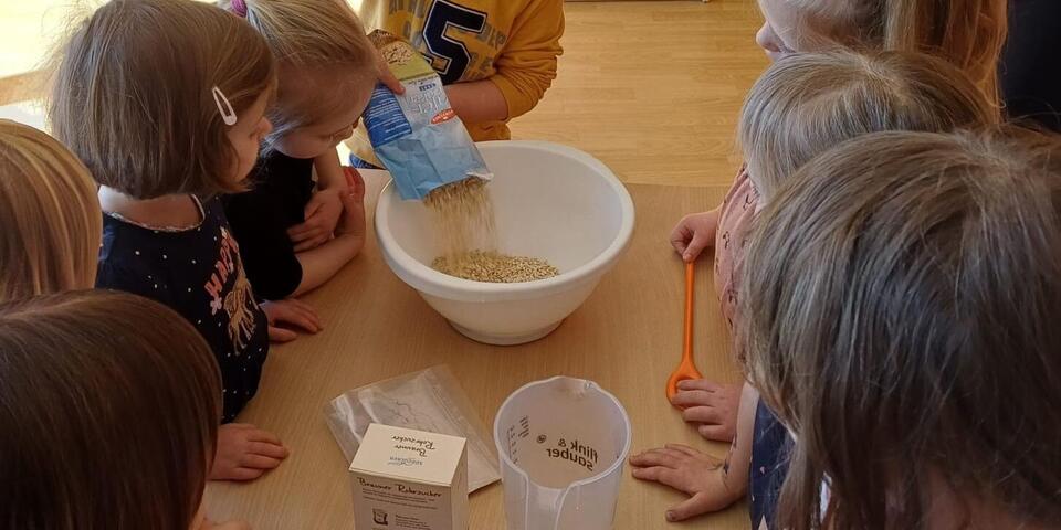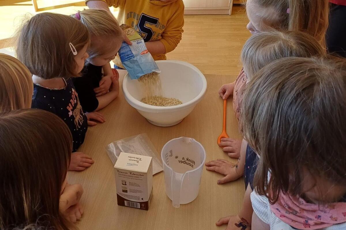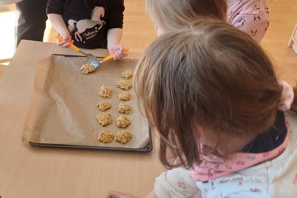 Außerdem wurden leckere Frühlingshaferplätzchen gebacken. Beim Wiegen der Zutaten und kneten des Teiges haben alle Kinder fleißig geholfen. Viel Fingerspitzengefühl brauchten sie dann für das Verteilen des Teiges in kleine Häufchen auf dem Backbleck, aus denen nach dem Backen Plätzchen geworden sind. Am Nachmittag wurden diese zum Vesper gemeinsam verspeist.